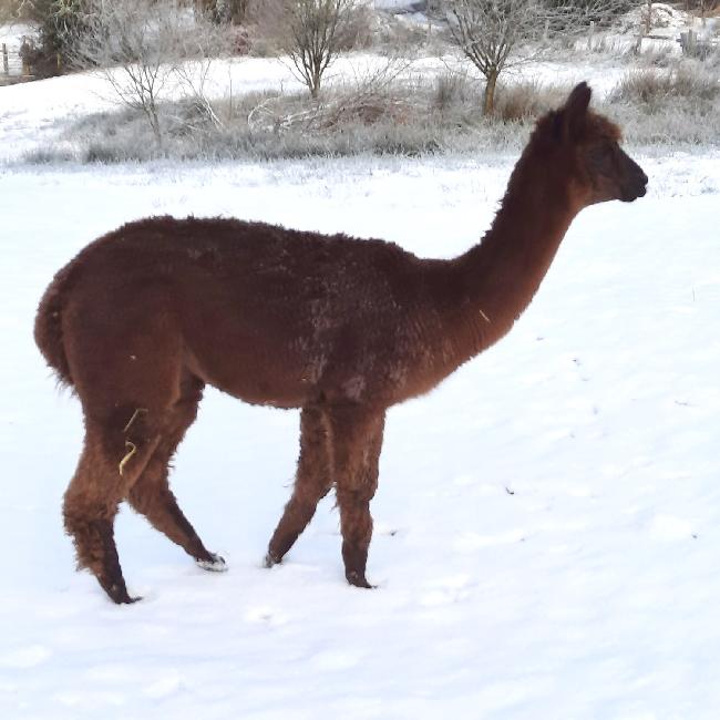 Solid mid brown female huacaya. Lovely natured non-breeding female, would make an ideal pet. Can be sold to join an existing herd of females or as a package of 3 or more.